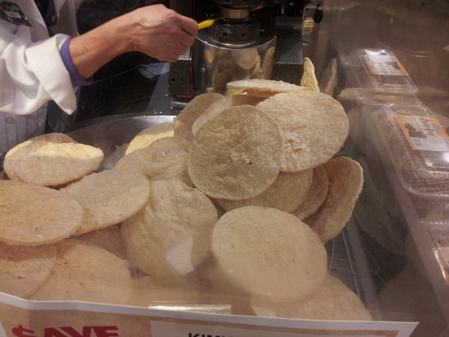 Also in Shop Rite during that visit, I heard a series of loud popping noises while I was in the produce area. The staff at the cheese counter had their Magic Pop machine running. I had seen Magic Pop before, but I never saw it being made. It was kind of impressive and reminded me of the pancake machine I ran into at a Holiday Inn. Dough gets squirted into a little contain, the container closes, I'm guessing a combination of heat and pressure makes it pop, and these little popcorn-esque Frisbees come flying out.