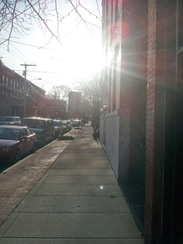 Here's the view looking back up the street directly into the blinding sun. That little gap in the cars by the light post is basically the entrance to Sally's. Location, location, location.